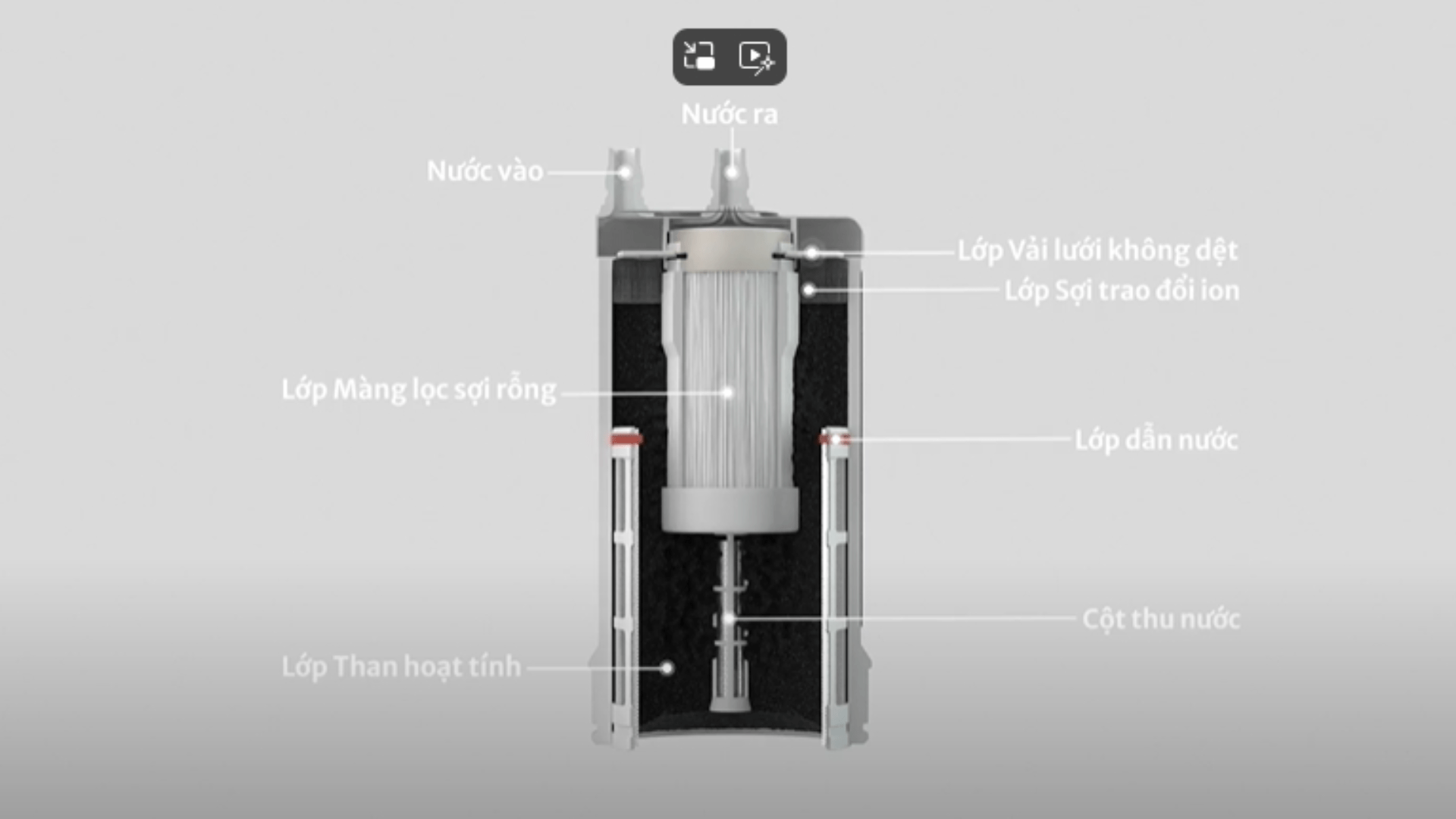Lớp màng lọc sợi rỗng loại bỏ các tạp chất có kích thước nhỏ tới 0,01 micromet như tảo, vi sinh vật, độ đục, vi khuẩn, rỉ sét, nấm mốc, các thành phần kim loại trong nước, đồng thời giữ lại khoáng chất tự nhiên có lợi cho sức khỏe