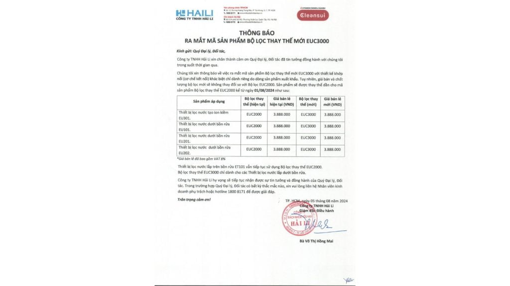 Bộ lọc EUC3000 được phân phối chính hãng tại Việt Nam kể từ tháng 8/ 2024. Chúng tôi cũng đã thông báo tới Quý đại lý/ đối tác và khách hàng.