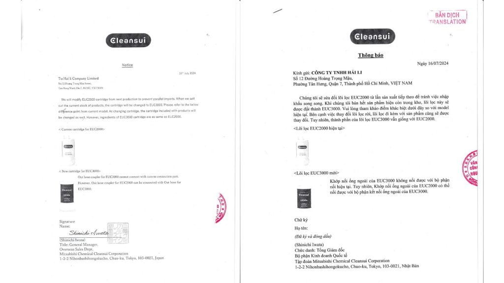 Thông báo từ Mitsubishi Cleansui Nhật Bản