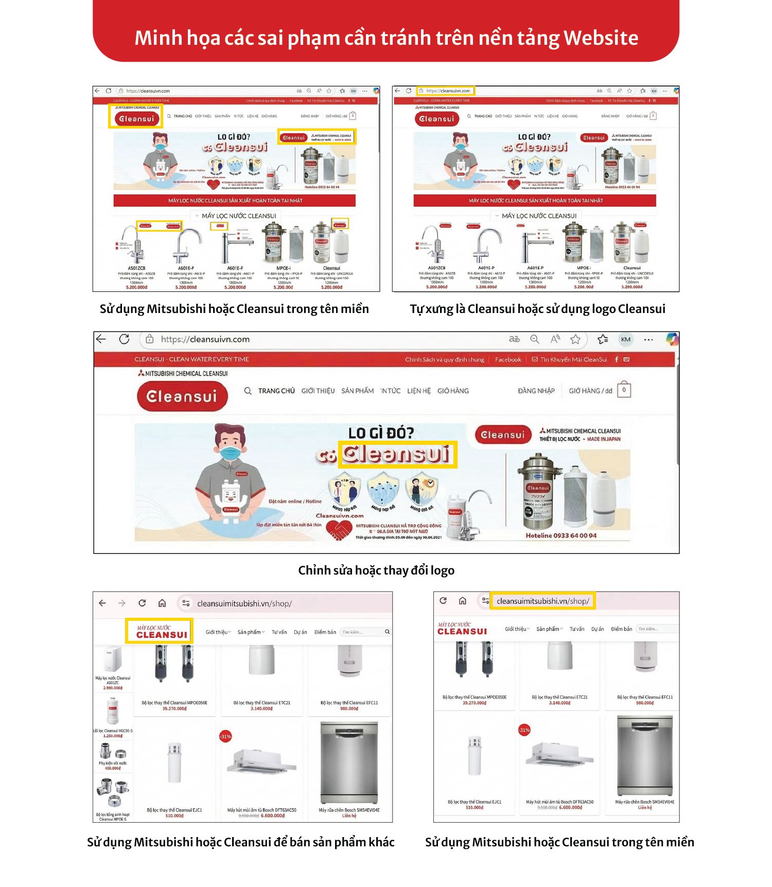 - Tên miền (Website): Không sử dụng các từ khóa “Mitsubishi” hoặc “Cleansui” trong tên miền chính.